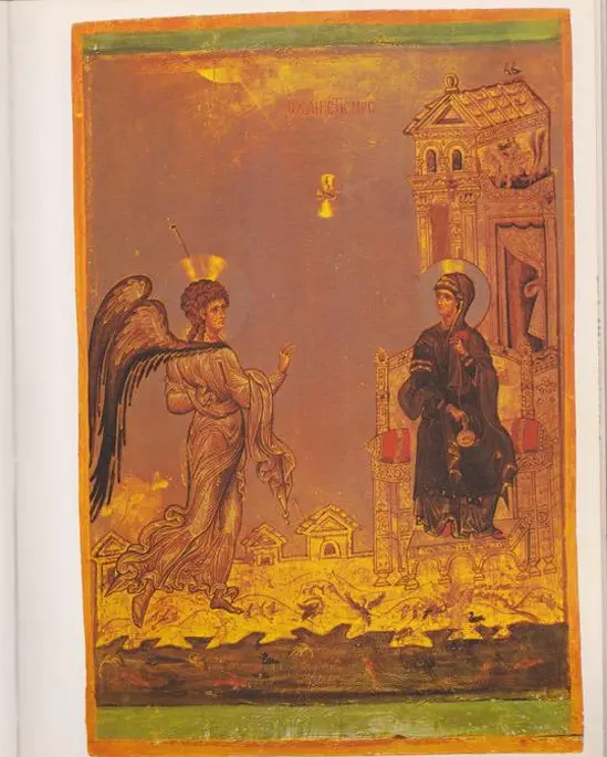 La dernière icône de cette présentation est ce chef d’oeuvre d’Annonciation, de qualité tout à fait remarquable pour sa grande sensibilité et son raffinement extrême. La Vierge est ici délicate, ce n’est plus la représentation un peu balourde du passé, elle apparaît tendue et appréhensive alors qu’elle délaisse son tissage, cependant que l’ange qui s’approche apparaît également hésitant à regarder le visage triste de la Vierge, qui anticipe sa détresse. Le mouvement serpentin de l’ange et l’agitation de son vêtement drapé vivifient l’intensité de la rencontre. La colombe du Saint Esprit est en suspens dans un médaillon doré au-dessus de la Vierge. À ses pieds, en bas de l’icône, une rivière de poissons et de poules d’eau illustrent une des épithètes de la Vierge, Cette rivière qui donne des grâces. Les couleurs sont peu diversifiées, réduites au bleu et au pourpre intense des habits de la Vierge, et de la bordure des ailes de l’ange, le rouge est intense pour le coussin et la laine et un bleu pour l’eau. Le reste est peint en or grisaille qui avive les stries du drap de l’ange et octroie une richesse exubérante au trône et à l’architecture du fond. Là encore, les disques tournant contribuent au scintillement de toute cette scène. L’icône, d’après Kurt Weizmann est certainement de facture constantinopolitaine et datable de la fin du XIIᵉ siècle.